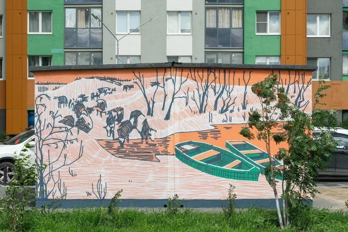 «Семья – самое главное в жизни каждого человека, но для жителей застраивающихся районов города это слово обретает особый смысл, – говорят организаторы фестиваля. – Ведь на новом месте важно создать уголок уюта, заботы и тепла. И именно это сделал для горожан Мансур Зияев, изобразив на будочках милые зарисовки – дружных соседей, зимний пейзаж, пасущихся коровок, реку и лодочки. Простые и понятные сюжеты добавляют в жизнь радости и помогают не забывать о доброте. Теперь баланс соблюден, и мы все стали одной большой семьей».