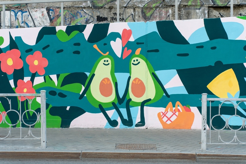 Серый забор превратился в джунгли, в которых дружат веселые авокадо и очень длинные крокодилы. Один из них катается на скейтборде, второй уснул в цветах, третий наслаждается фруктами и овощами.