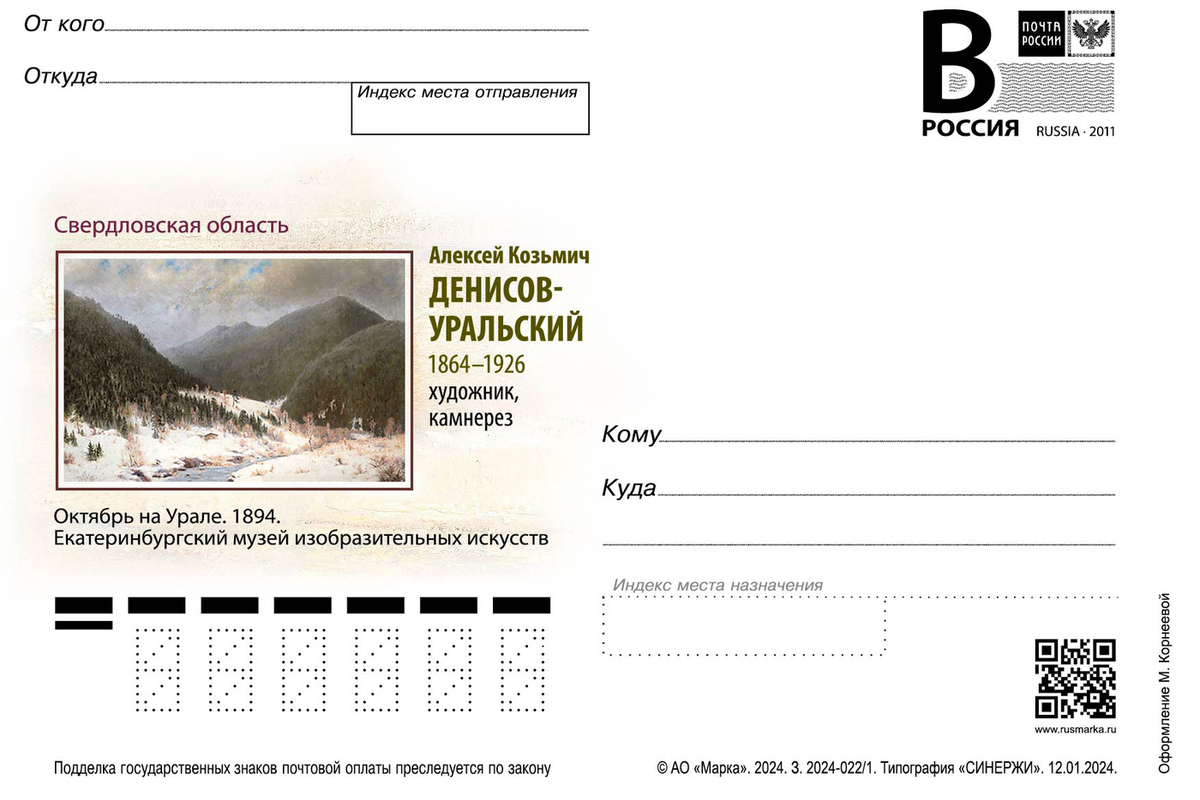 22 февраля состоялась презентация карточки в честь 160-летия уральского художника и камнереза Алексея Денисова-Уральского. Она была выпущена по инициативе Екатеринбургского Музея изобразительных искусств и Почты России.