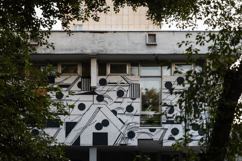 Мурал содержит всего два цвета: темно-серый и белый. Эти оттенки «врастают» в архитектуру здания, помогают воспринимать все как чертеж, визуальную формулу.
