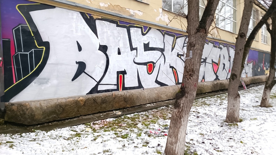 В центре Екатеринбурга, на улице Бажова, на стене детско-юношеской спортивной школы №3 имени Мышкина А.Д. восстанавливают сильно пострадавшее от вандалов и от частичного отслоения штукатурки граффити в честь баскетбола.