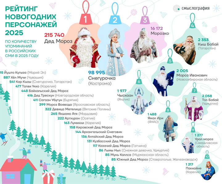 «Второй год мы попадаем в топ-10 новогодних персонажей страны, что для “молодого” персонажа хороший показатель. Важно понимать контекст конкуренции: выше Урал Мороза в рейтинге расположились персонажи с многовековой историей, глубоко укорененные в этнической культуре своих регионов – Тол Бабай, Ямал Ири, Чысхаан, Кыш Бабай», – рассказала директор «Парка Сказов» Алиса Ларионова.