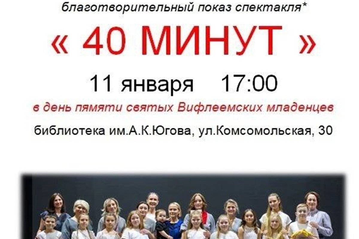 В Кургане 11 января, в день памяти Вифлеемских младенцев, в 17:00 в областной библиотеке имени Югова состоится благотворительный спектакль "40 минут". Жителей и гостей Кургана приглашают на показ.