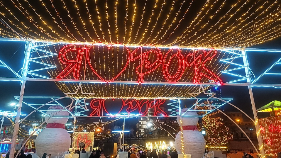 На новогодней площадке входные арки оформлены в виде традиционного жеста фанатов рок-музыки, рок-концепции соответствуют ледяные лабиринты, традиционные снеговики показывают рокерскую «козу», стоя под перетяжками с гирляндами с надписью «Я люблю рок».