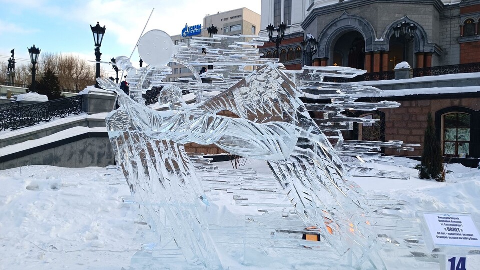 Около ворот ледяной Георгий Победоносец поражает копьем змея. Рядом расположена композиция на тему «Техника России: 65 лет со дня первого в мире запуска корабля в космос с человеком на борту – полет Юрия Гагарина (12 апреля 1961 г.)»: космонавт летит над Земным шаром на фоне созвездий. Тут же – еще одна композиция со станцией «Луна-10» на орбите.