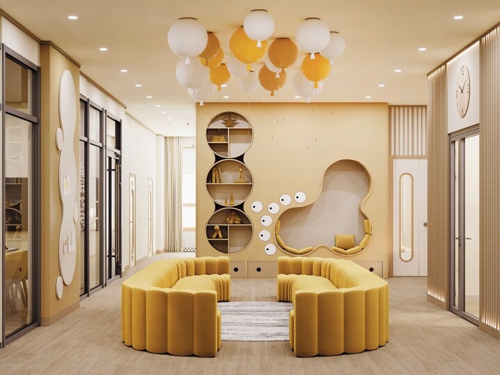 В новом доме создан уникальный детский сад на 118 мест для малышей в возрасте с 2 до 7 лет. У него будет закрытая территория. Дошкольное учреждение разместился на первом и втором этажах, его общая площадь составила 2 тысячи квадратных метров. В детсаду оборудованы мастерские для детей, музыкальный и спортивный зал, комплекс 3D физкультуры С.Реуцкого, медицинские комнаты.