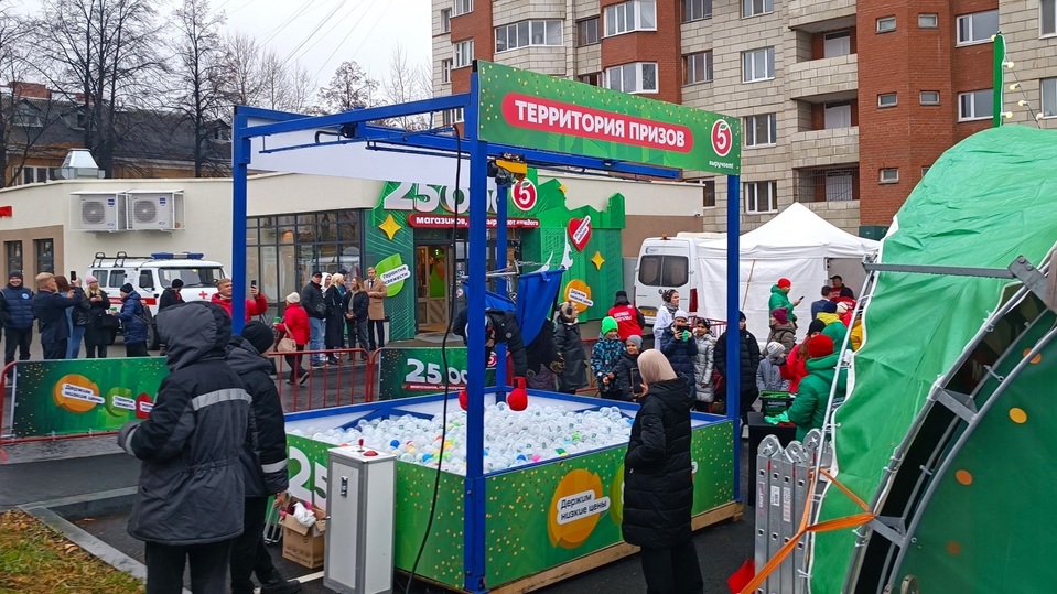 Площадку поделили на зоны с активностями и призами: аттракционы для малышей, интерактивные опросы для взрослых, «Хватайка»-гигант с краном-подвеской для игрока, стенд с атрибутикой компании, фотозона, веранда с кафе.