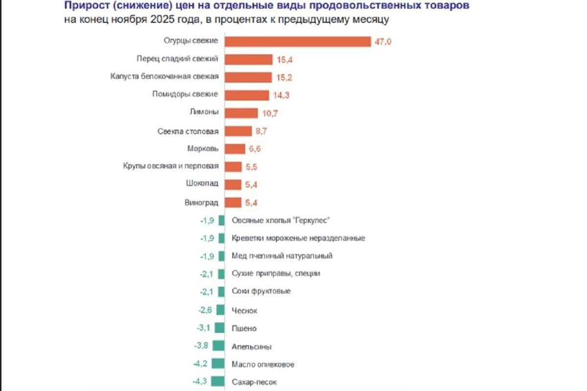 На 47%, в полтора раза, выросла стоимость огурцов. На 1 декабря килограмм этого овоща стоит 207 рублей. Сладкий перец стал дороже на 15,4%, белокочанная капуста – на 15,2% (33 рубля за килограмм), свежие помидоры – на 14,3% (224 рубля за килограмм), лимоны – на 10,7%, шоколад – на 5,4%, виноград – на 5,4%.