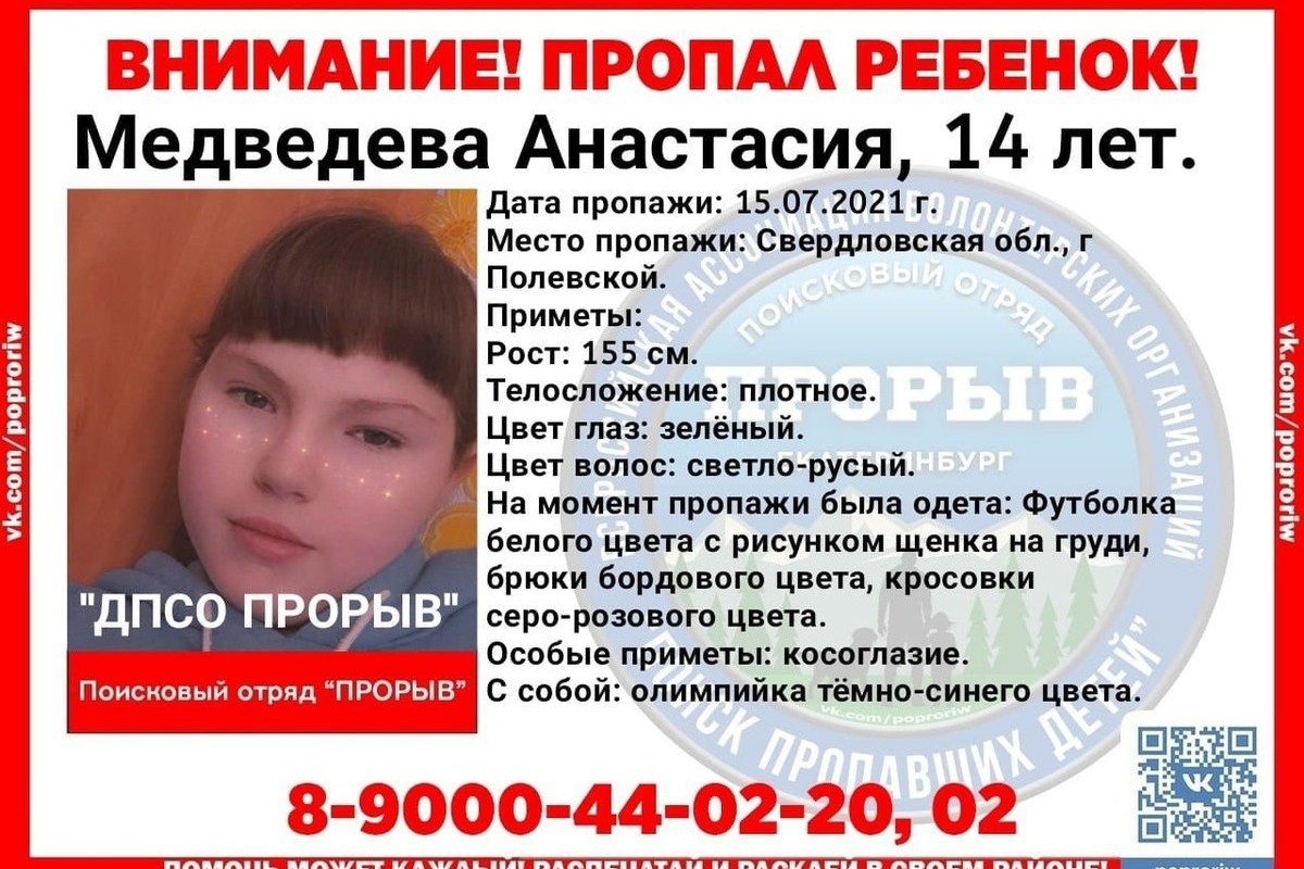 С 15 июля сотрудники полиции и волонтеры ищут 14-летнюю Анастасию Медведеву из Полевского. Она пропала в родном городе, ее местонахождение неизвестно.