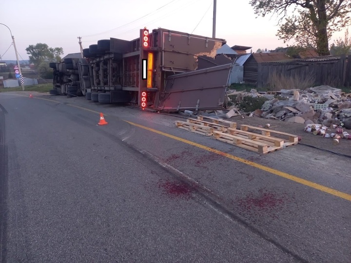 В селе Логиново, по которому проходит трасса, водитель грузовика допустил съезд с дороги и опрокидывание транспортного средства. При этом фура повредила две бетонные опоры ЛЭП.