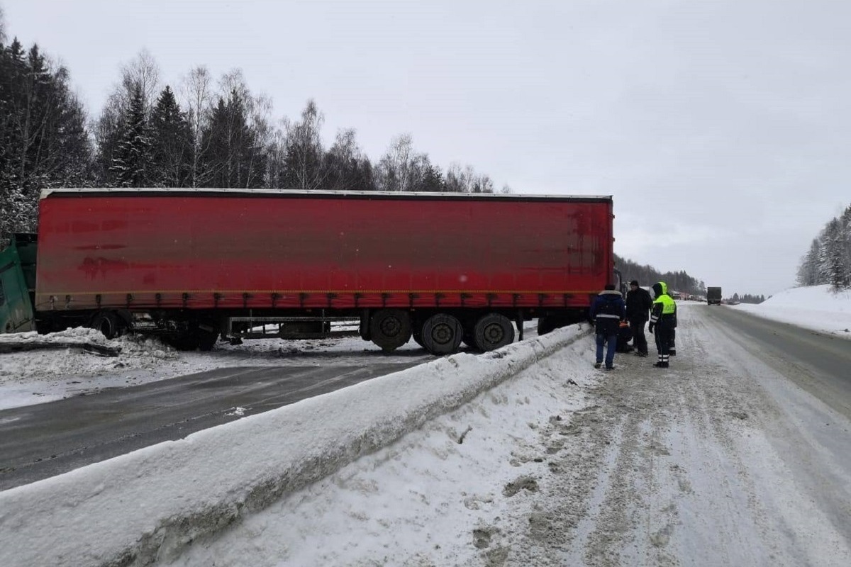 По предварительным данным, водитель фуры не справился с управлением и допустил занос. В аварии никто не пострадал. Но прицеп грузовика перегородил дорогу.