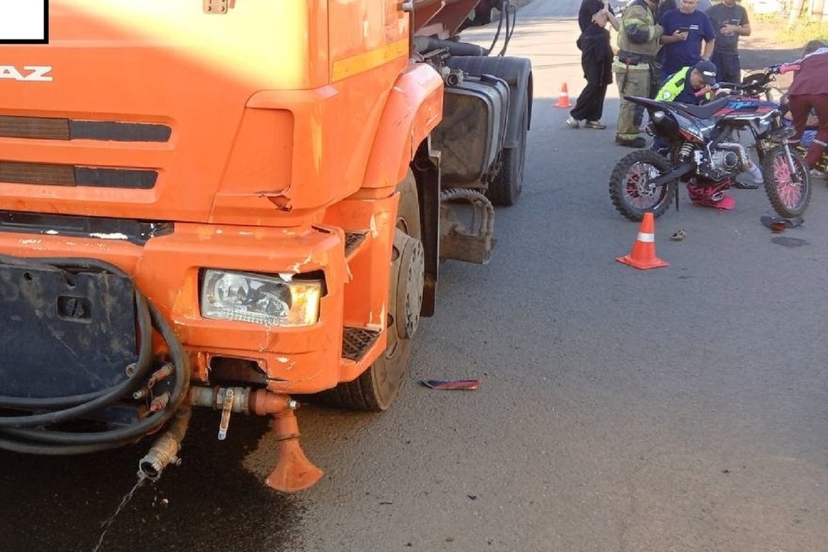 ДТП произошло возле дома № 50 на улице Сережи Тюленина. По предварительным данным, водитель байка JHI Моto Drive-125, без государственных регистрационных знаков, не справился с управлением и допустил столкновение с грузовиком КАМАЗ.