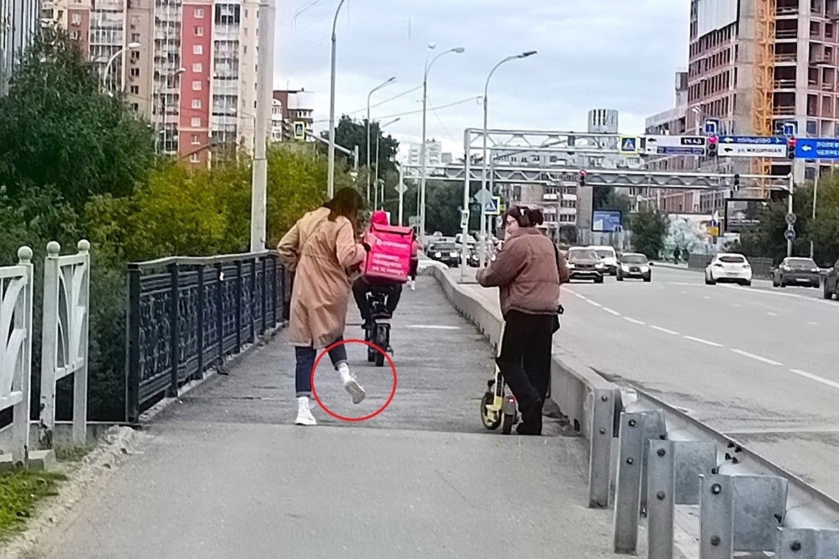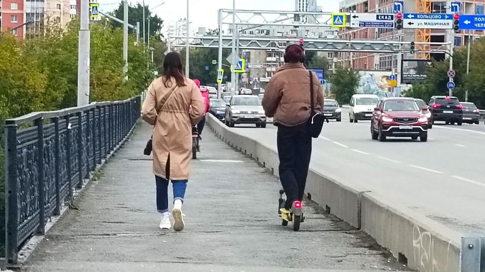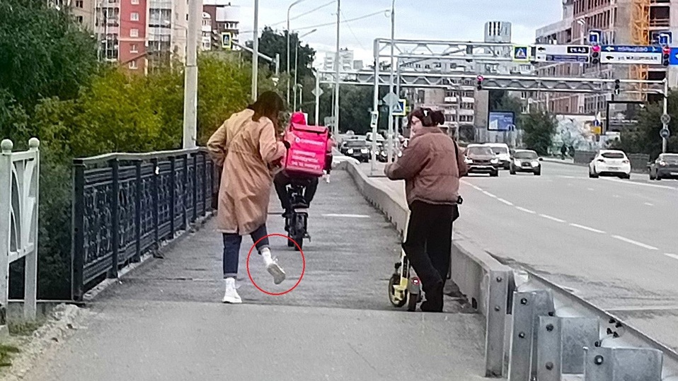 Днем 31 августа в Екатеринбурге водитель электросамоката (с дизайном как у прокатной техники «Яндекс») совершила наезд на девушку-пешехода и покинула место ДТП.