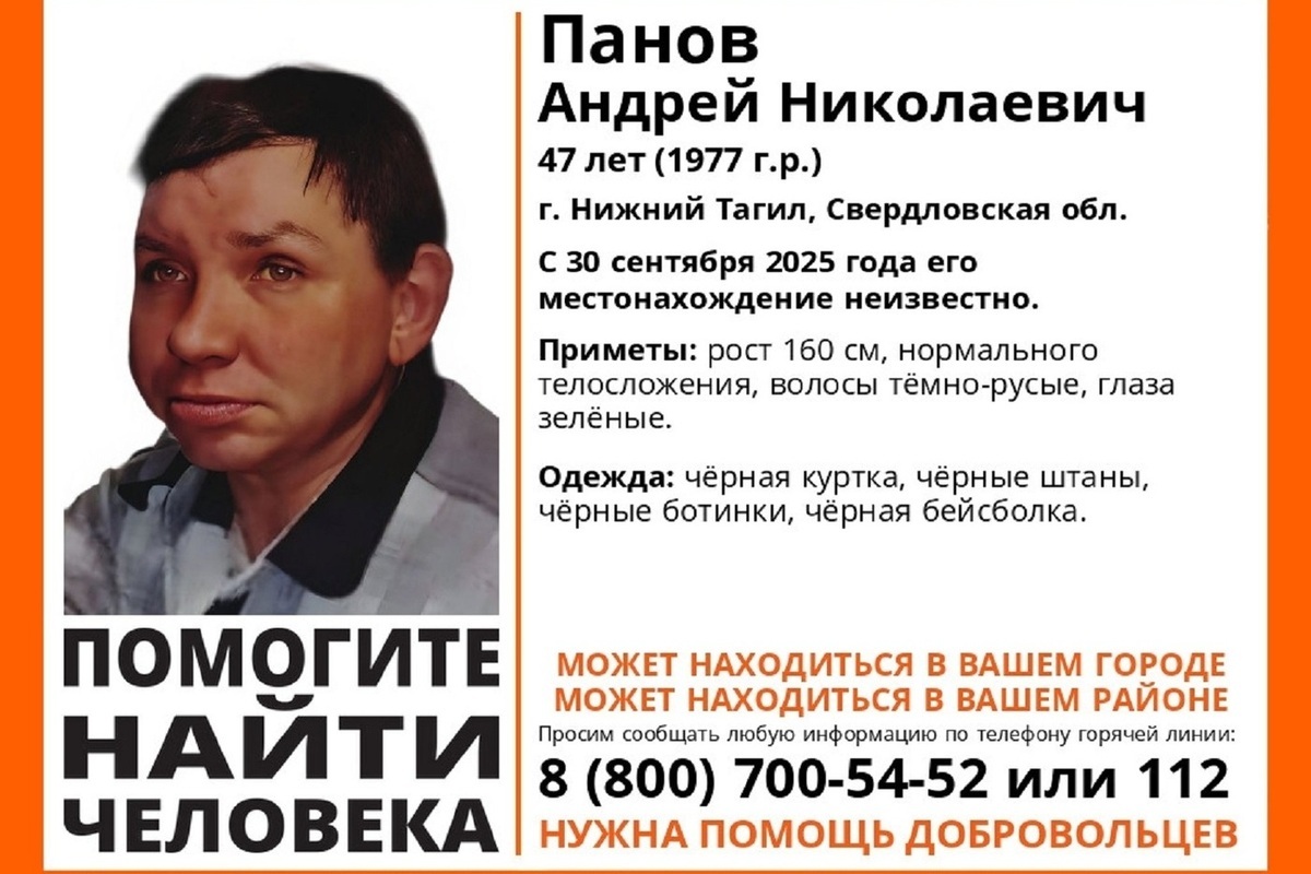 «Лиза Алерт» (8 (800) 700-54-52) сообщает о розыске пропавшего жителя Нижнего Тагила Панова Андрея Николаевича (возраст – 47 лет, 1977 г.р.).