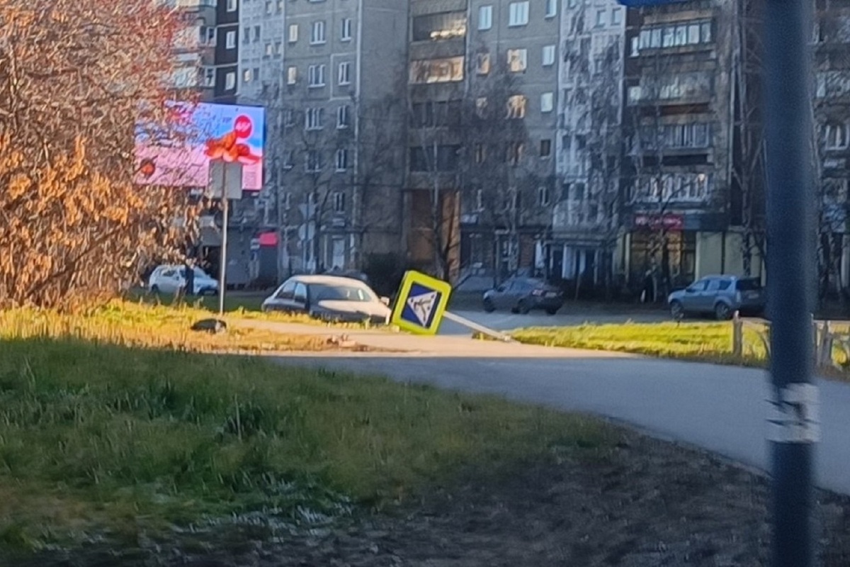 В Екатеринбурге, на улице Академика Бардина, неизвестное транспортное средство сбило столб со знаком пешеходного перехода, а также часть дорожного ограждения.
