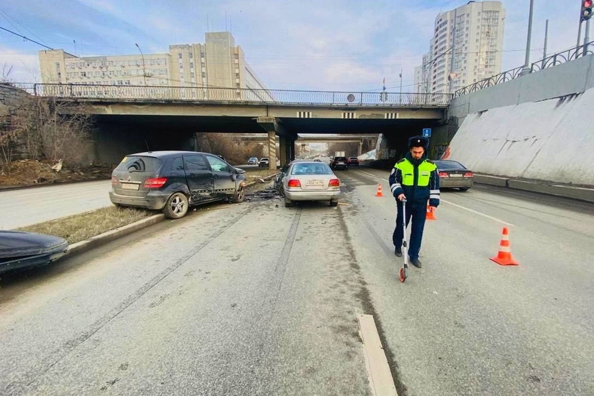 Сегодня днем на улице Серафимы Дерябиной в Екатеринбурге произошла массовая авария с пострадавшими. Автомобиль Honda вылетела на встречную полосу, где столкнулся с Mercedes, а затем с Toyota.