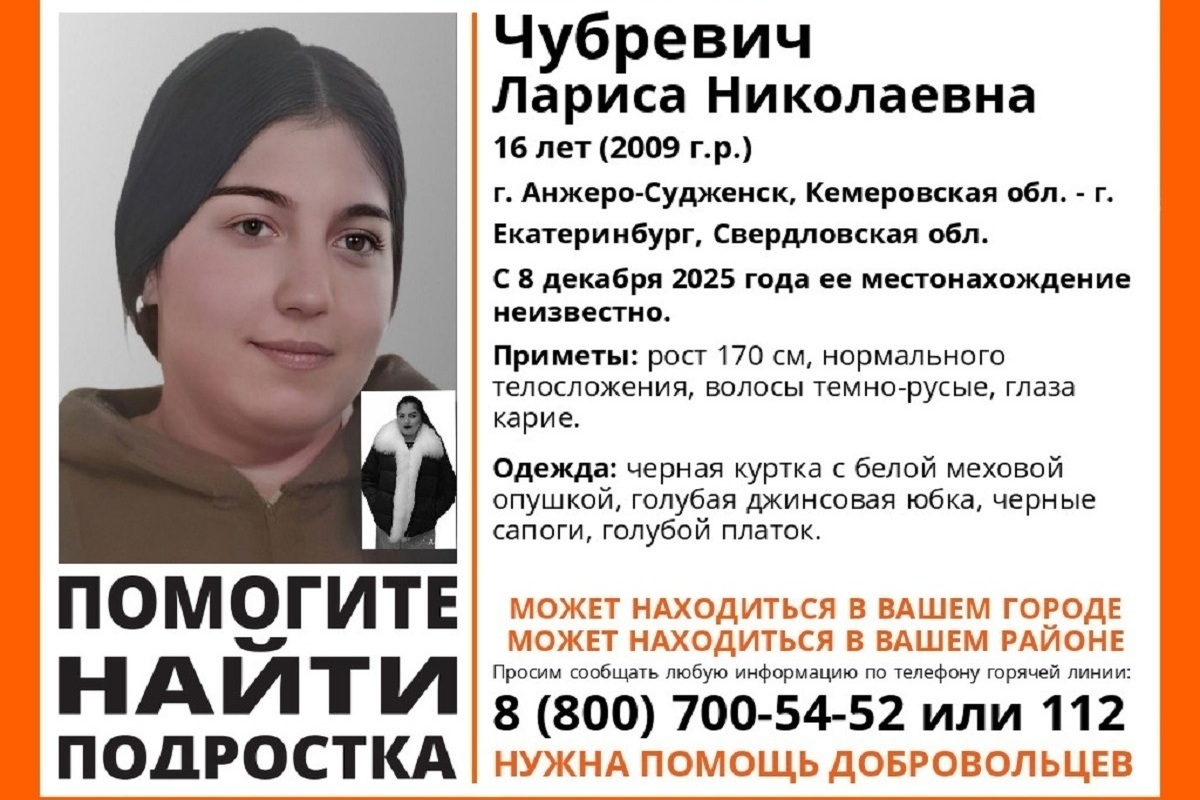 В Свердловской области начались поиски 16-летней Ларисы Чубревич. Несовершеннолетняя пропала 8 декабря.