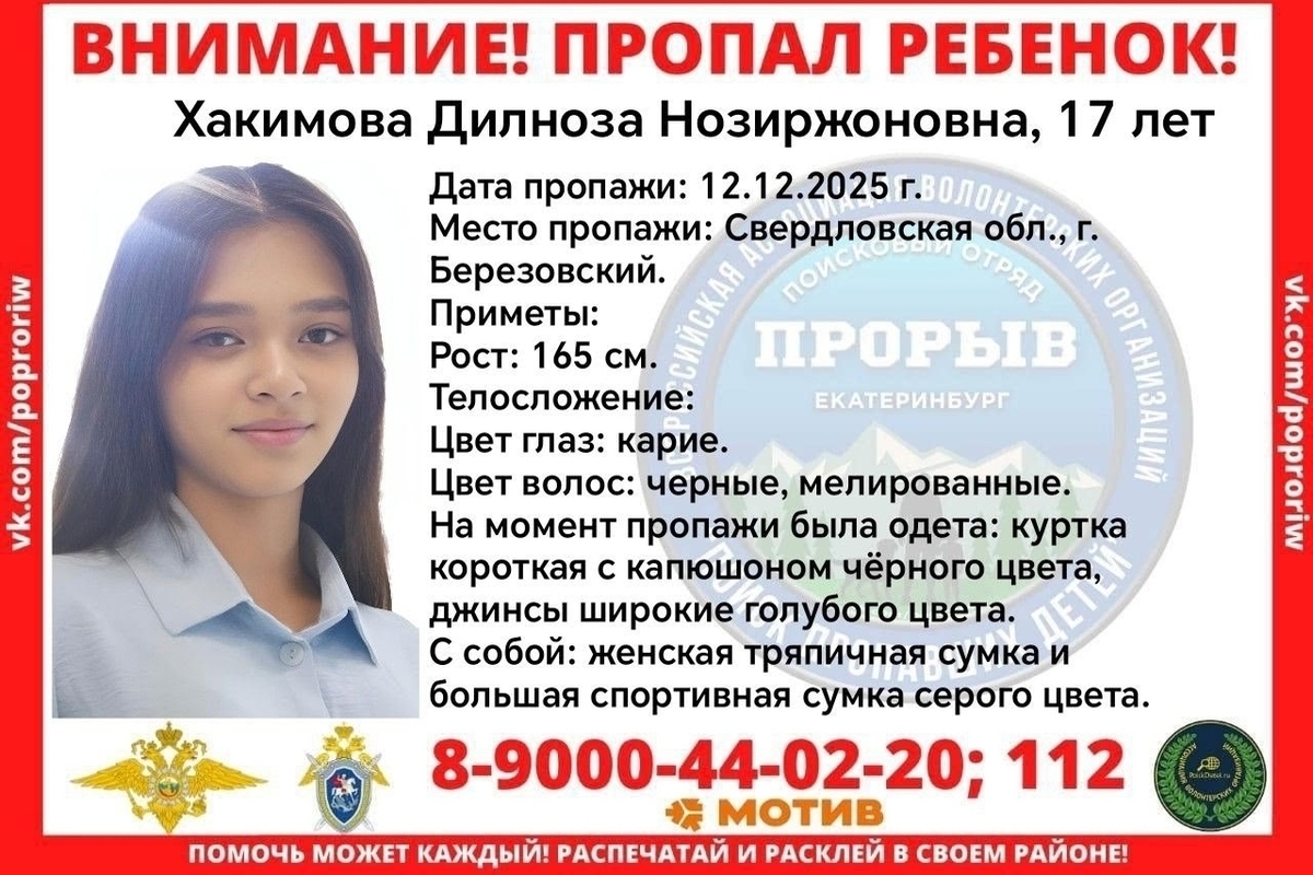 О местонахождении Дилнозы можно сообщить по телефонам: +7 343 694-75-00 (ОВД Березовского), 112 , 102, 89000440220 (отряд «Прорыв»).