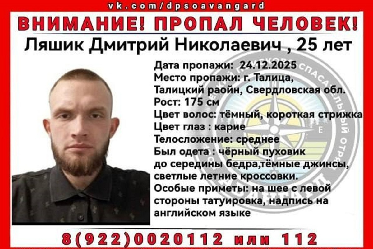 25-летний Ляшик Дмитрий Николаевич пропал 24 декабря 2025 года в Свердловской области. Последний раз его видели в городе Талица.