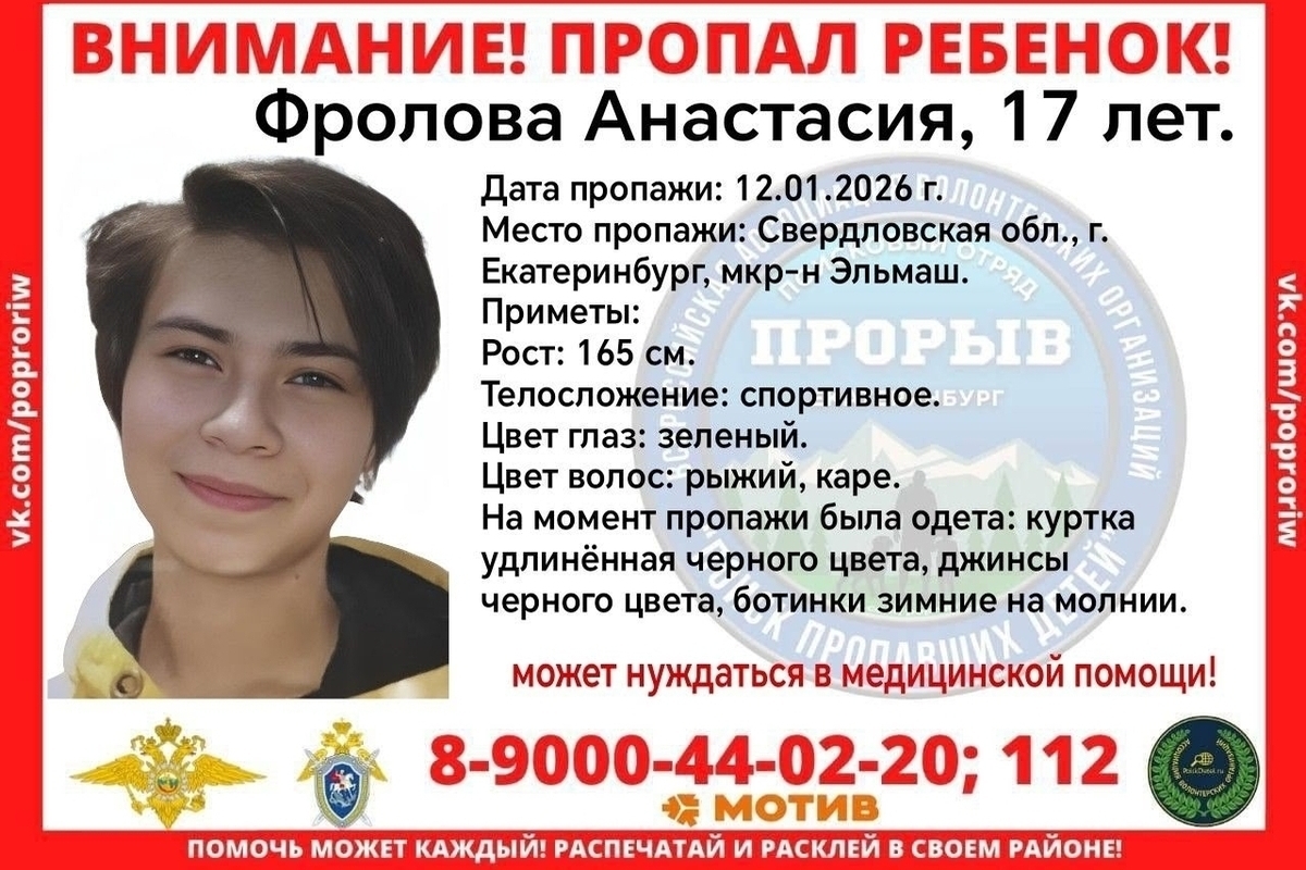 В Екатеринбурге начаты поиски 17-летней Анастасии Фроловой. Ее местонахождение неизвестно с 12 января.