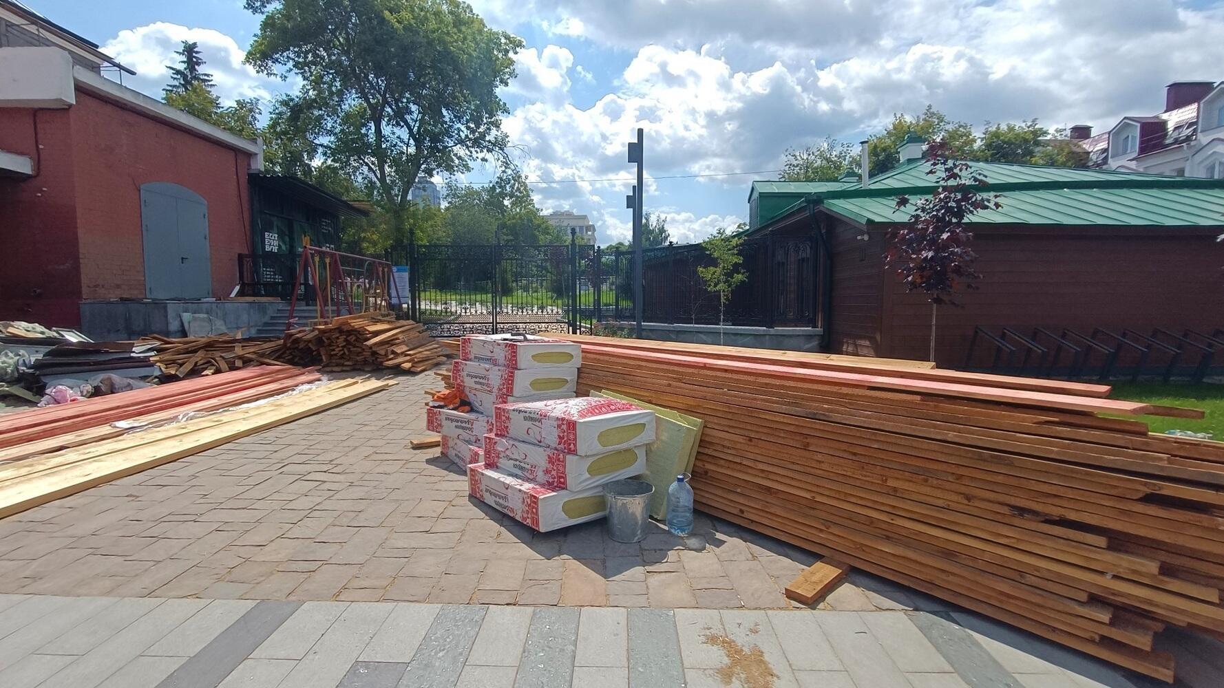 В настоящее время монтаж утеплителя идет в районе входной группы театра. Также рабочие демонтировали часть стеклопакетов.
