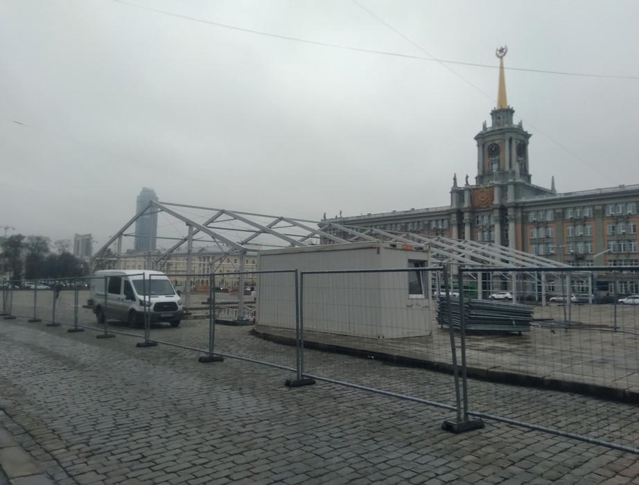 Площадь 1905 года уже огородили. Рабочие монтируют конструкцию, где будут проходить различные мероприятия. Кроме этого будут выравнивать территорию, чтобы каток был ровным.