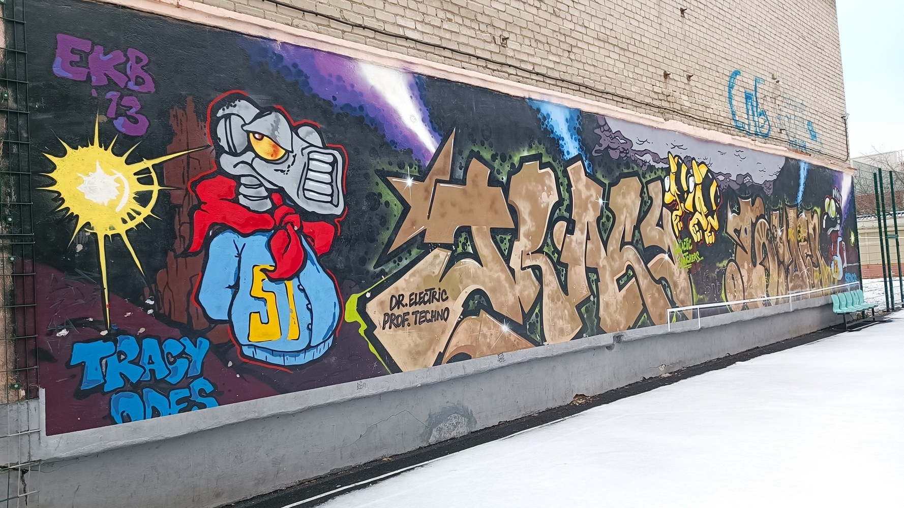 В Екатеринбурге, на стене детско-юношеской спортивной школы №3 имени Мышкина А.Д. (ул. Бажова, 132), в выходные ремонтировали граффити, посвященное баскетболу. Мурал частично пострадал от действий вандалов, частично – в результате отслаивания штукатурки.