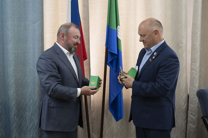 Заместить председателя городской думы Екатеринбурга Виктор Тестов и летчик-космонавт Олег Артемьев/фото: пресс-служба гордумы Екатеринбурга