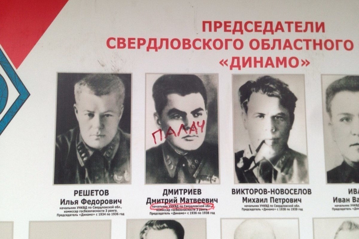 Тут же историк обосновал появление надписи «Палач»: «Когда в феврале у здания екатеринбургского Главпочтамта в честь 95-летия спортивного общества «Динамо» впервые были выставлены стенды с портретами возглавлявших областное отделение этого общества руководителей Управления НКВД по Свердловской области, на руках которых кровь 18 тысяч человек за 15 месяцев Большого террора (убивали в среднем 100 человек в день), я поперёк лица самой зловещей и отвратительной из этих фигур написал красным фломастером: ПАЛАЧ. Тогда же я обещал делать это всякий раз, как увижу портрет этого человека в общественном месте».