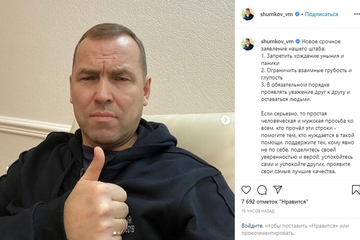 Губернатор Курганской области Вадим Шумков попросил помогать тем, кто нуждается в помощи из-за коронавируса. В своем Инстаграме он опубликовал срочное заявление штаба: запретить хождение уныния и паники, в обязательном порядке проявлять уважение друг к другу и оставаться людьми, ограничить взаимные грубость и глупость. ⠀
