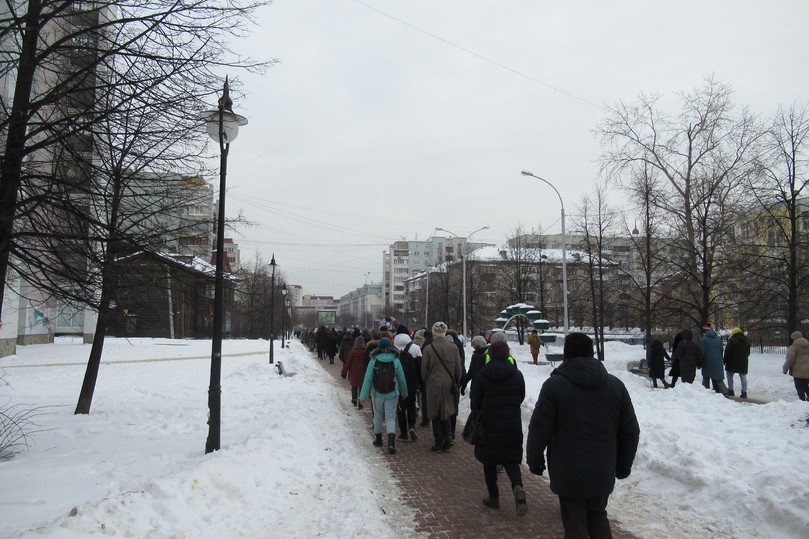 После непродолжительного стояния в сквере часть участников несанкционированной акции пошла в сторону ККТ «Космос» по льду Городского пруда (там некоторые постояли в сквере у Динамо, другие пошли в сторону метро, третьи небольшой группой двинулись к Ленина.