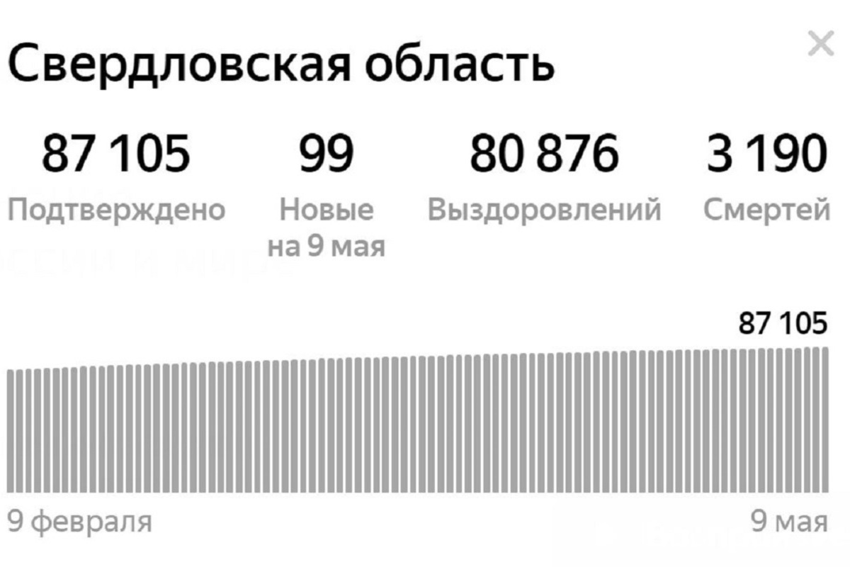 99 новых случаев COVID-19 зарегистрировали в Свердловской области за сутки. Общее число инфицированных в области по данным на 9 мая – 87 105. За сутки выписался 121 житель региона, всего – 80 876 человек. Продолжается лечение менее 3,1 тысячи больных COVID-19. В тяжелом состоянии 246 госпитализированных.