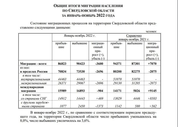 Поток мигрантов в Свердловскую область вырос всего на 1,8 тысячи (около 16 тысяч человек). В результате, с учетом резкого роста числа уехавших из региона, вместо миграционного прирост в 9,1 тысячи человек 2021 года в 2022 году наблюдается убыль в 904 человека.
