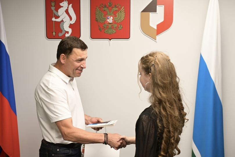 В флагманском центре «Мои документы» предусмотрен зал для торжественного вручения паспортов гражданина. Евгений Куйвашев вручил документ восьми юным свердловчанам.