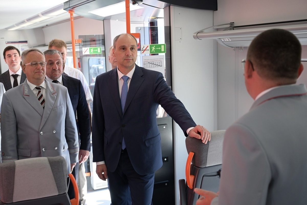 Перед отправкой первого поезда по маршруту Екатеринбург – Верх-Нейвинский начальник Свердловской железной дороги Павел Бурцев провел для Дениса Паслера экскурсию по новейшему электропоезду «Финист», выпущенному в июне, с асинхронными тяговыми двигателями.