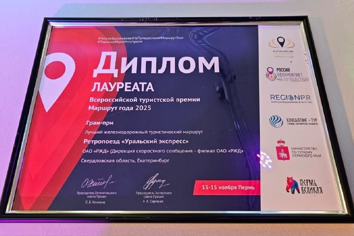 За три года «Уральский экспресс» прокатил порядка 65 тысяч пассажиров. А в 2025 году ретро-поезд удостоился престижной награды – Гран-при национальной туристической премии «Маршрут года», получив признание жюри благодаря своему удивительному колориту, глубокой исторической атмосфере и высококлассному сервису.