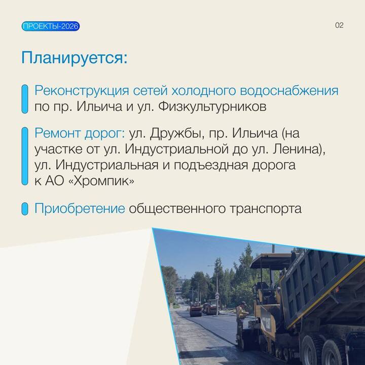 Кроме этого планируется реконструировать сети холодного водоснабжения по проспекту Ильича и на улице Физкультурников. Намерены отремонтировать дороги на улицах Дружбы и Индустриальной, на проспекте Ильича (от Индустриальной до Ленина), на подъездной дороге к АО «Хромпик». Также обновят общественный транспорт.