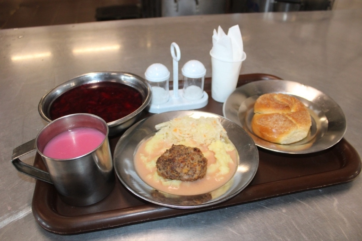 1 января для них приготовили винегрет, суп «Свекольник», говяжьи котлеты с пюре, ягодный кисель. 2 января их будут кормить крестьянским салатом, гуляшом и компотом из сухофруктов, а также запеченной рыбой с жареным картофелем.