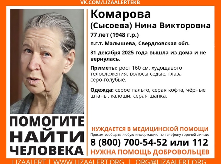 Нина Комарова пропала в пгт Малышева. Она также вышла из дома 31 января, с тех пор ее никто не видел. Она была одета в пальто серого цвета, черные штаны, на голове – серая шапка, на ногах – калоши.