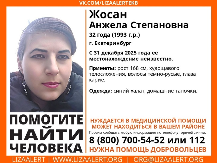 32-летняя Анжела Жосан ушла из дома в Екатеринбурге в халате и домашних тапочках. Пропавшая худощавого телосложения, у нее нее темно-русые волосы и карие глаза.