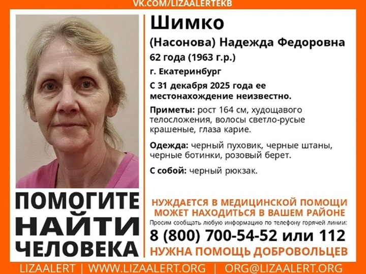 Жительница Екатеринбурга 62-летняя Надежда Шимко поехала к родственнице, чтобы поздравить ее с Новым годом, но до места так и не добралась. Последний раз её видели, когда она собиралась пойти к остановке троллейбуса «Пединститут».