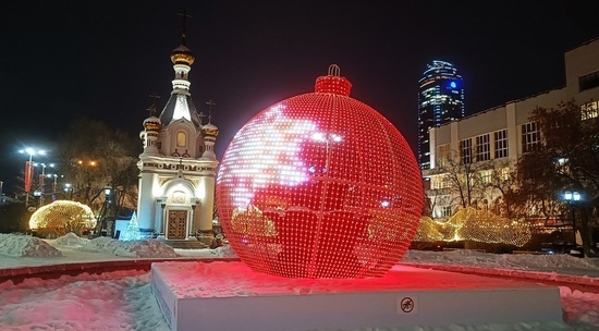 В Екатеринбурге, около часовни Святой Екатерины, советский памятник фонтан «Каменный цветок» вновь превратили в огромный новогодний шар. Диаметр мультимедийного арт-объекта – около пяти метров.